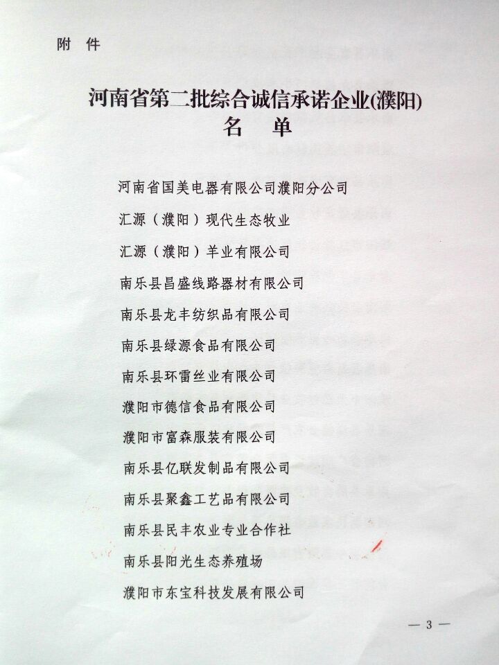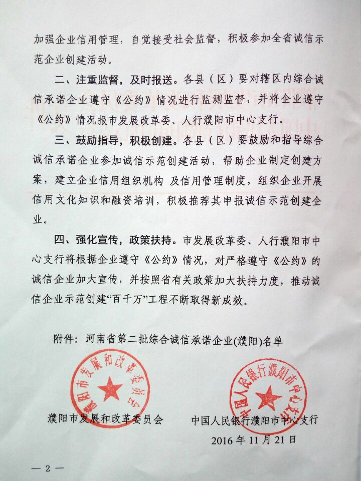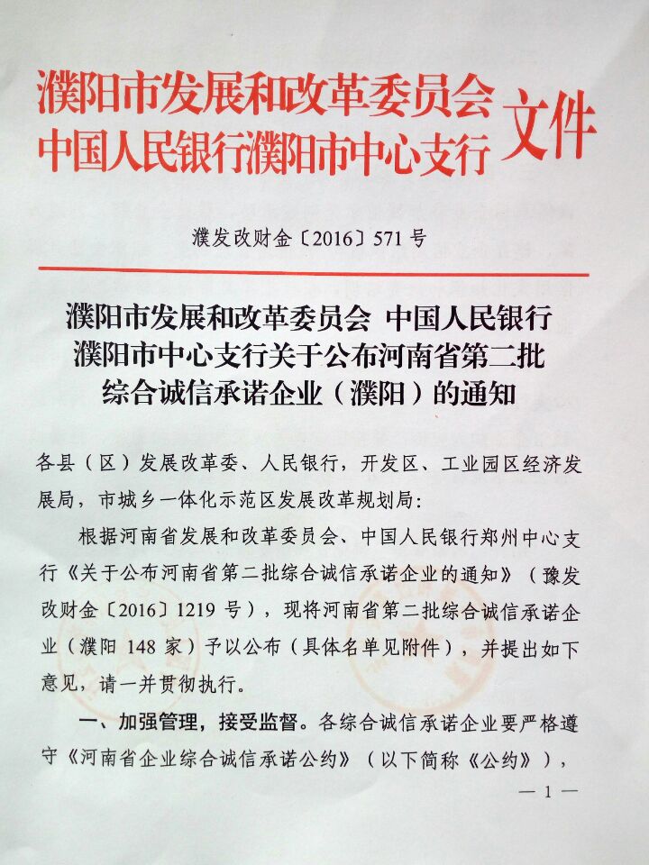 根據(jù)河南省發(fā)改委、中國(guó)人行鄭州支行通知要求,濮陽(yáng)市發(fā)改委、人行濮陽(yáng)中心支行近日聯(lián)合下發(fā)了河南省第二批誠(chéng)信承諾企業(yè)(濮陽(yáng))名單,我公司也在名單之內(nèi)!