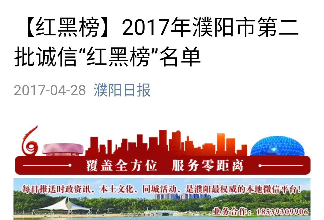 4月28日,2017年濮陽市第二批誠信“紅黑榜”名單發(fā)布,市人行發(fā)布金融行業(yè)誠信“紅黑榜”名單(4個),我公司榮登濮陽市金融行業(yè)誠信紅榜名單。