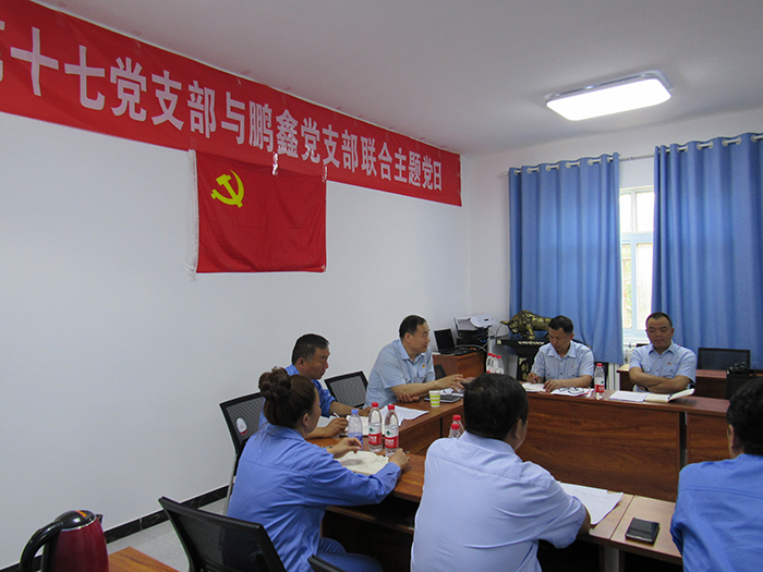5月31日下午,濮陽市中級人民法院第十七、十八黨支部與濮陽市鵬鑫化工有限公司黨支部共計二十余名黨員在市鵬鑫公司會議室開展主題黨日活動?;顒幼h程由市法院紀檢書記左獻民和市鵬鑫公司董事長趙永杰共同主持。