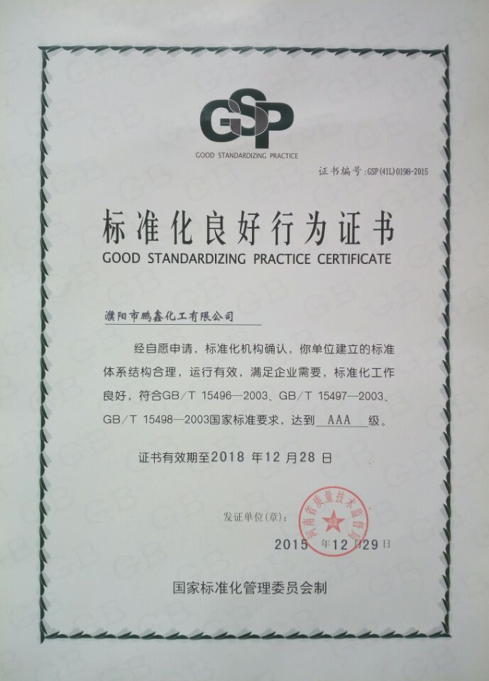 近日,公司順利通過(guò)河南省和濮陽(yáng)市標(biāo)準(zhǔn)化專(zhuān)家組驗(yàn)收,獲得“標(biāo)準(zhǔn)化良好行為企業(yè)”3A級(jí)證書(shū),此次標(biāo)準(zhǔn)化良好行業(yè)企業(yè)證書(shū)的獲得,表明公司各種標(biāo)準(zhǔn)體系建立結(jié)構(gòu)合理,在生產(chǎn)經(jīng)營(yíng)管理中有效發(fā)揮系統(tǒng)作用,滿(mǎn)足企業(yè)的需求,且全體員工的標(biāo)準(zhǔn)化意識(shí)有了較大提高,能有效推動(dòng)企業(yè)標(biāo)準(zhǔn)化工作的運(yùn)行。這標(biāo)志著鵬鑫化工已進(jìn)入標(biāo)準(zhǔn)化、程序化、規(guī)范化、科學(xué)化的發(fā)展軌道。